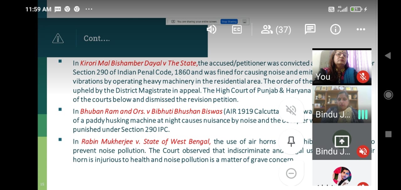 An online expert talk was organized by Shree Jee Baba College of Law, Semri, Mathura on the topic, “Noise Pollution and its Hazardous effects on Enviornment ” by Prof. (Dr.) Bindu Jindal, Head and Dean, Department of Law, MMDU Mullana on 03-03-2022.